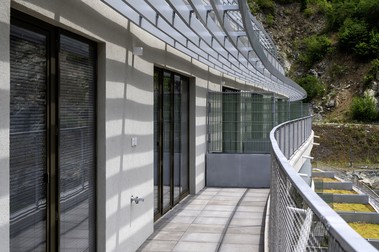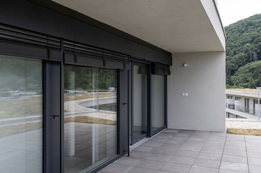 Významnou roli v celém projektu DIORIT sehrála okna, která určují nejen charakter fasády, ale také kvalitu života uvnitř bytů. Už od začátku byl kladen maximální důraz na technickou vyspělost, špičkové tepelně-izolační vlastnosti a prémiový design. Specifickým požadavkem investorů byly i předokenní žaluzie nabízené jako nadstandardní vybavení. A právě zde se projevil jeden z největších konstrukčních oříšků – půdorysně obloukový tvar budovy. Klasické podomítkové kastlíky nebylo možné použít, a to jak kvůli nevhodné geometrii, tak kvůli riziku vzniku tepelných mostů. Řešení nakonec přinesly kompozitní okenní sysy REHAU (PROGRESS – výrobce DAFE-PLAST Jihlava) s hliníkovou obložkou ALU EF+, které umožňují plně integrované venkovní stínění bez nutnosti podomítkových schránek. Veškeré prvky jsou součástí samotného okna, což výrazně zjednodušilo montáž a zároveň přineslo čistší, elegantnější vzhled celé fasády. Ve štítových stěnách byly navíc instalovány velkoformátové HS portály z téhož kompozitního materiálu, dosahující až 10 metrů délky. I u těchto prvků se podařilo udržet vysokou energetickou efektivitu s hodnotou Uw = 0,88 W/m2K. Pro zajištění maximální tepelné stability byla okna ve vnitrobloku instalována v plně předsazené sysové montáži DAFE PUREX BASIC, u uliční fasády a štítů pak v polopředsazené variantě s vysazením o 30 mm. Tím se eliminovaly možné tepelné mosty a zároveň se podařilo přizpůsobit montáž specifickému obloukovému tvaru objektu.
