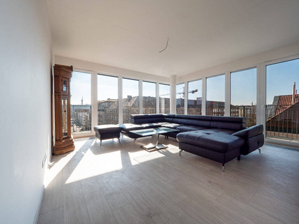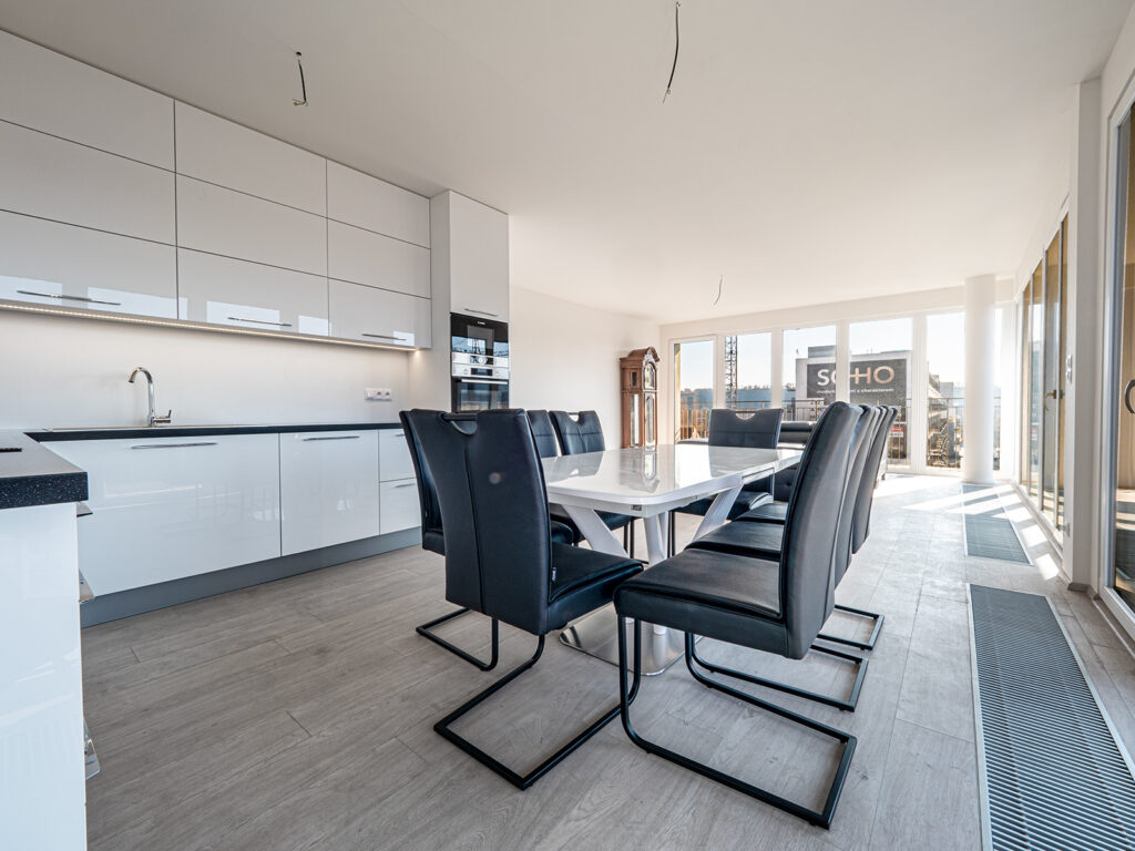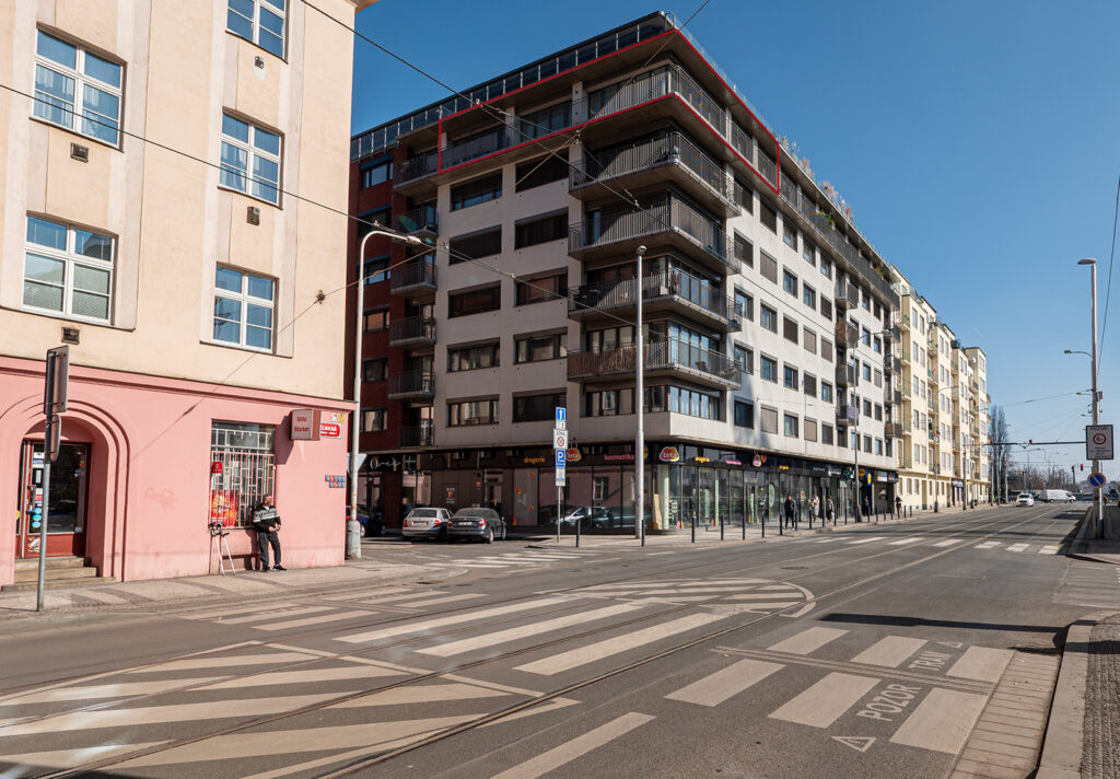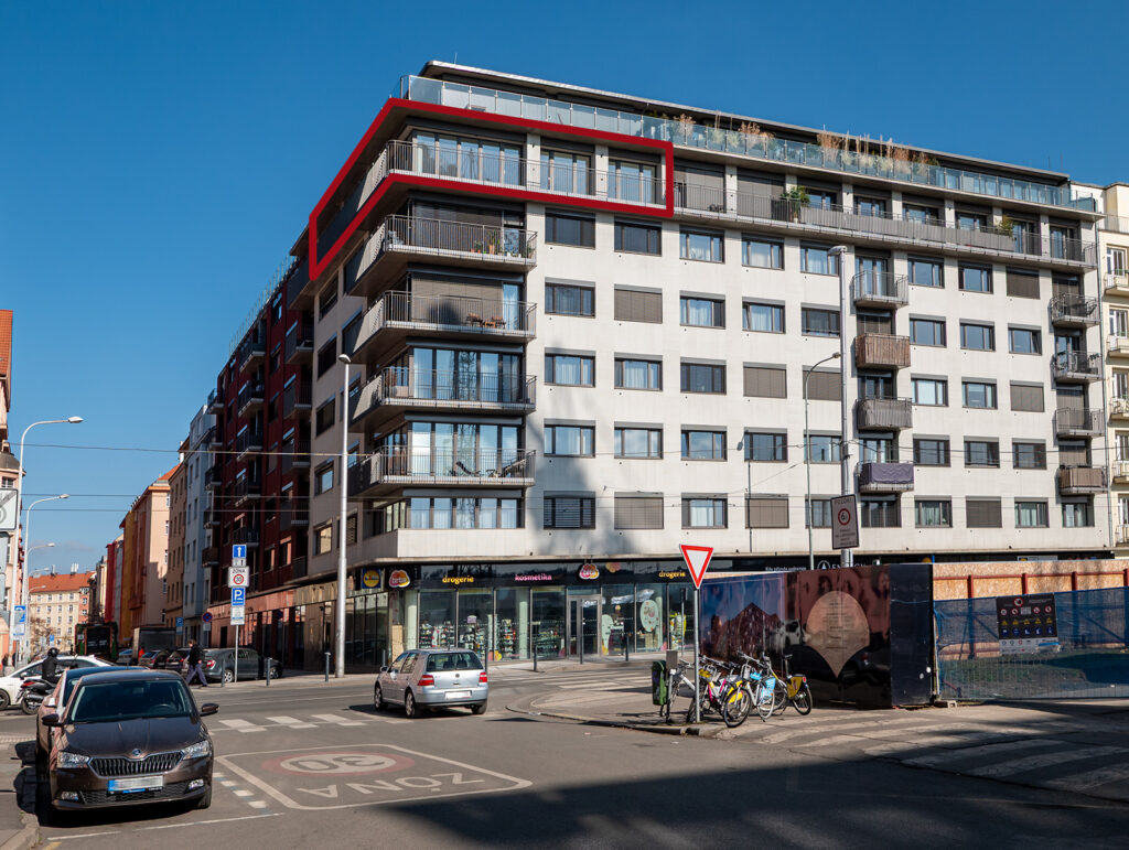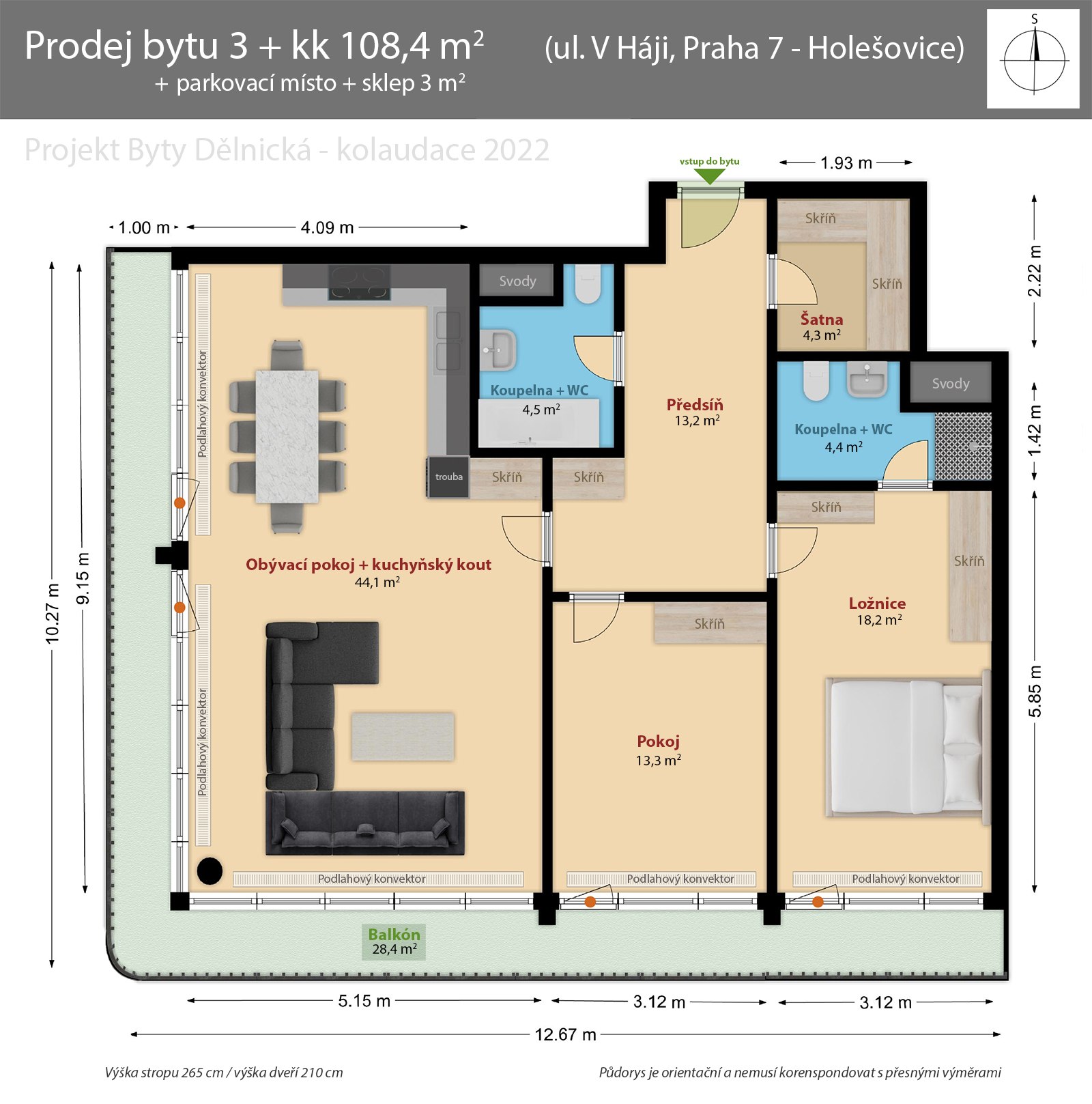 Prodej prostorného bytu v osobním vlastnictví v novostavbě z r. 2022 (Byty Dělnická) s dispozicí 3+kk o výměře 108,4 m², který se nachází ve 7. nadzemním podlaží v ul. V Háji (Praha 7 – Holešovice) Vytápění je řešeno dálkově – tepelnými konvektory. Okna bytu směřují na jiho-západ. Stav bytu je patrný z přiložené fotodokumentace – v bytě se dosud nebydlelo, byt je částečně zařízen a tyto věci jsou součástí prodeje. Při vstupu do bytu se dostaneme do prostorné předsíně (13,2 m²), ze které je vstup do šatny (4,3 m²) s vestavěnými skříněmi, koupelny s WC a vanou (4,5 m²), pokojem (13,3 m²), ložnicí (18,2 m²) ze které je vstup do další koupelny s WC (4,4 m²), zde je sprchový kout. Dominantu tvoří obývací pokoj s kuchyňským koutem (44,1 m²), kde je i potřebné zařízení (kuchyňský stůl, židle, kožená sedačka a kompletní kuchyňská linka s indukční varnou deskou, troubou, mikrovlnou troubou, myčkou a digestoří. Ze všech místností je vstup na balkon (28,4 m²), který obepíná celou jižní a západní stranu. K bytu též náleží sklep ve 4.PP s výměrou cca 3 m², a parkovací místo, které je vedle tohoto sklepa.