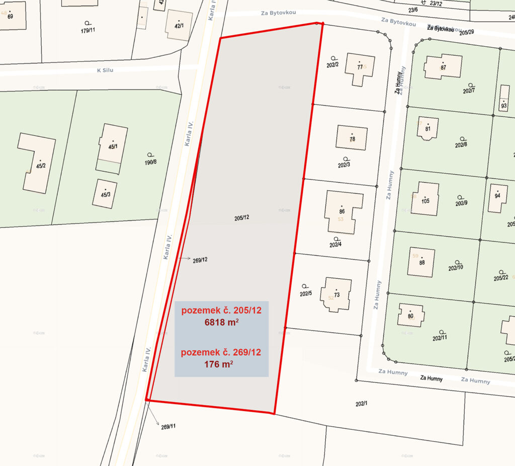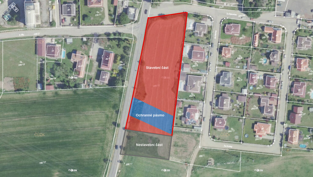 Varianta č. 1 – 3 parcely pro 3 RD (1000m²+1000m²+4075m²+ pozemní komunikace cca 800 – 1000m²)
