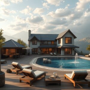 Jednoduchý dům s bazénem nabízí dokonalé prostředí pro odpočinek a spojení s přírodou.