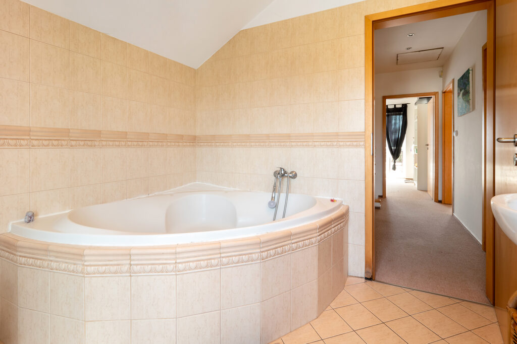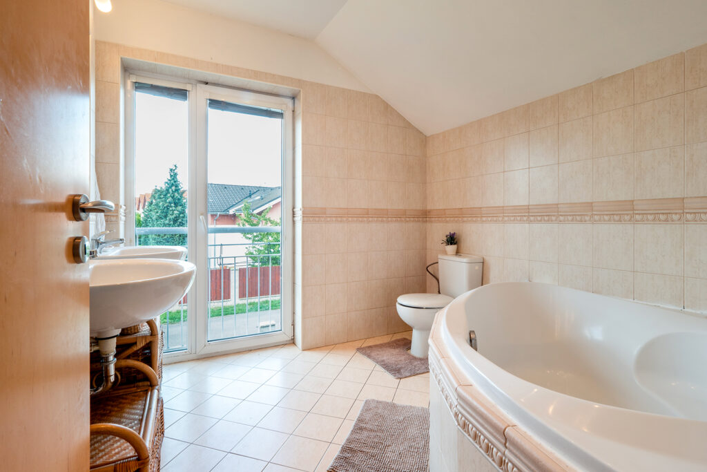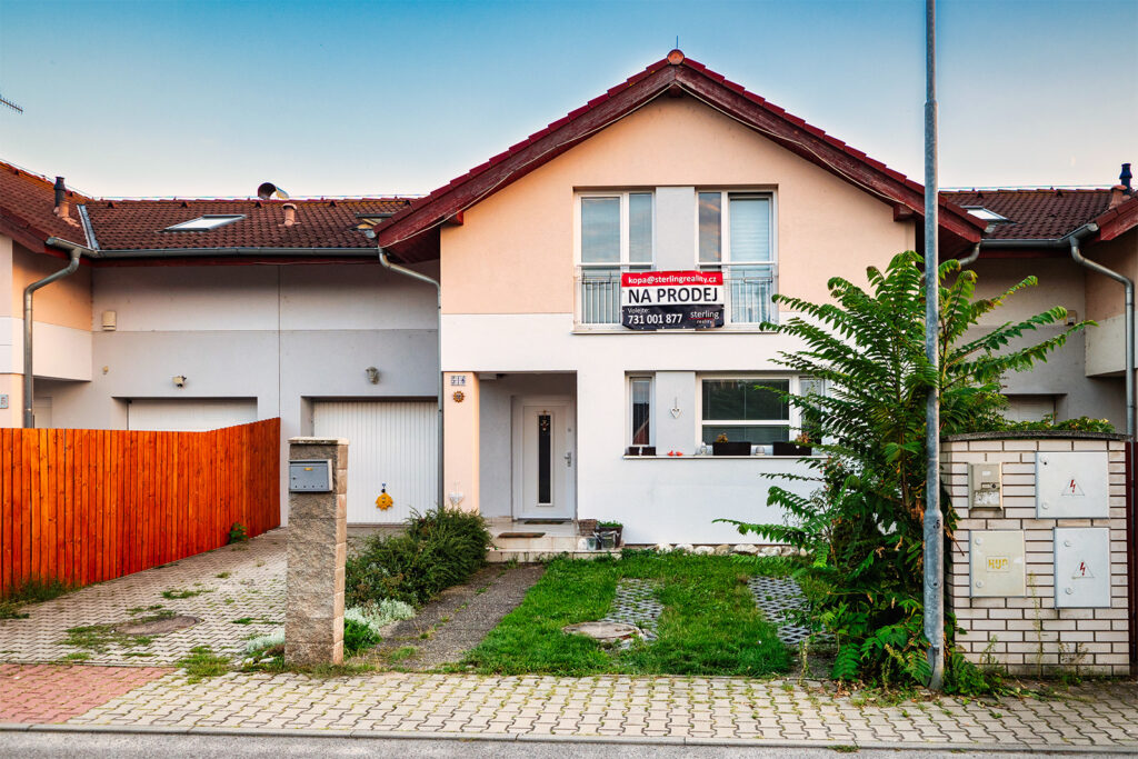 Přízemí domu tvoří prostorná chodba s plynovým kotlem Vaillant, separátní WC a prostorného obývacího pokoje s kuchyňským koutem (42,1 m2) kdy kuchyňskému koutu dominuje na míru dělaná kuchyňská linka, z obývacího pokoje je vstup na zahradu se vzrostlými keři a zpevněnou nezastřešenou terasu. Ze zahrady je možnost vstupu do garáže o velikosti 6x3m. Z obývacího pokoje je vstup do 1.patra, kde je koupelna s rohovou vanou a WC (7,2 m2) a dále ložnice (18 m2) a tři pokoje (9,4 m2, 12,4 m2 a 14,6 m2), zde ze dvou pokojů je vstup na balkon, který je směřován do zahrady (4,8 m2), před schodištěm mezi pokoji je rozlehlá chodba (10,1 m2). Před domem je předzahrádka, kdy vstup do domu je zastřešen. Dům je napojen na veškeré IS.