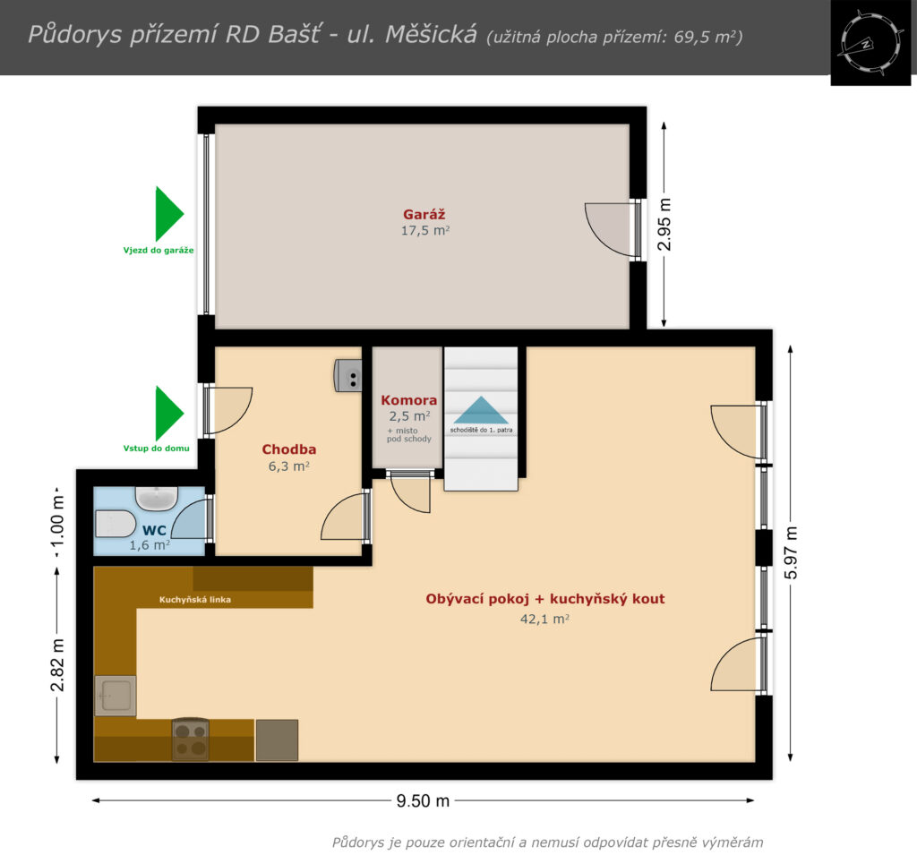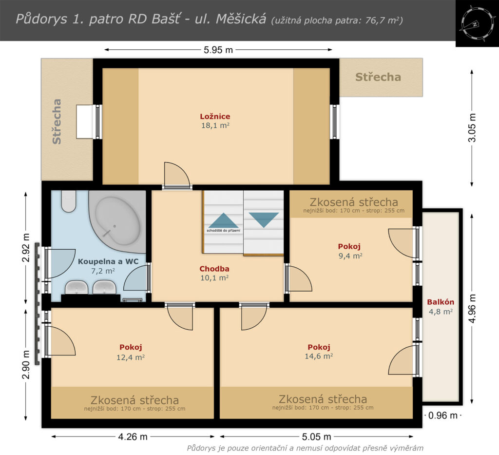 Prodej patrového RD v obci Bašť, ul. Měšická, Praha – východ z roku 2005 s dispozicí 5+kk s podlahovou plochou 153 m2 (zastavěná plocha 92 m2) s předzahrádkou (66 m2) a zahradou (140 m2 – vč. zpevněné nezastřešené terasy 25 m2). V domě je vlastní garáž (17,5 m2).