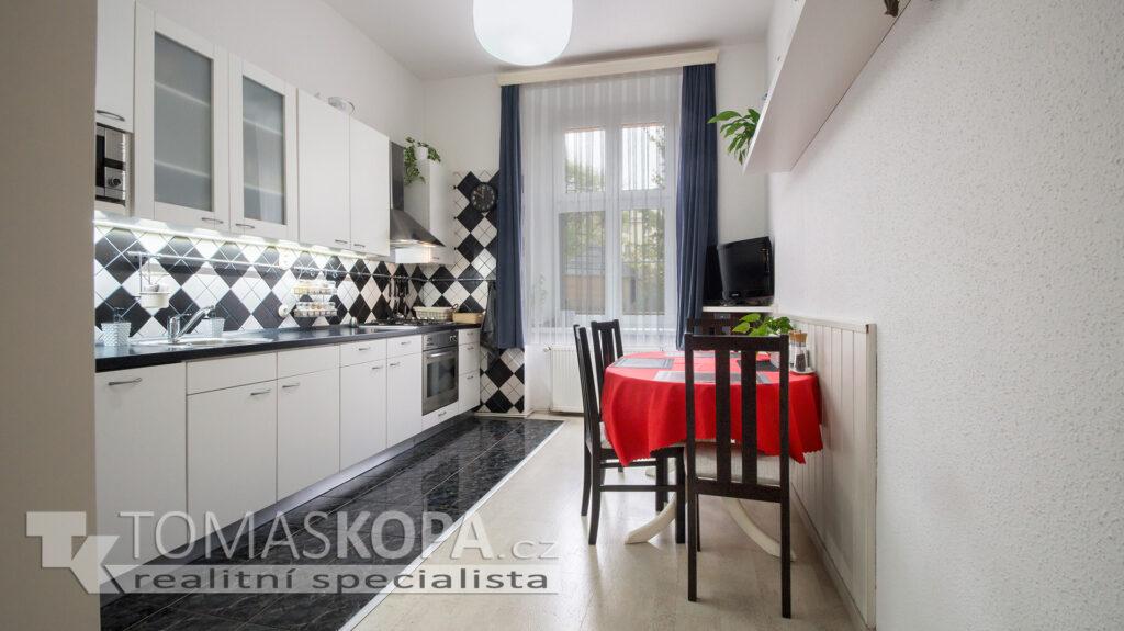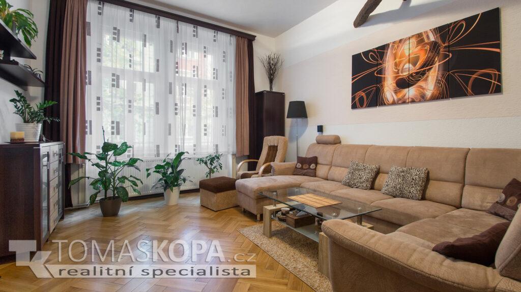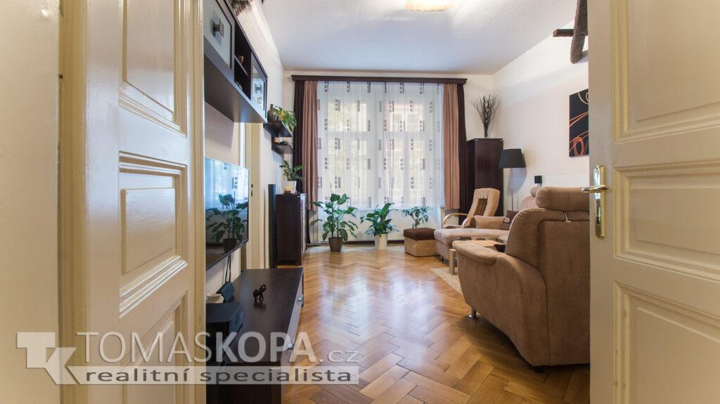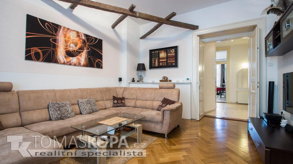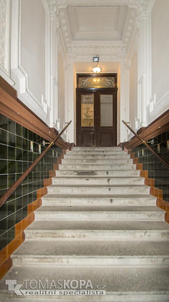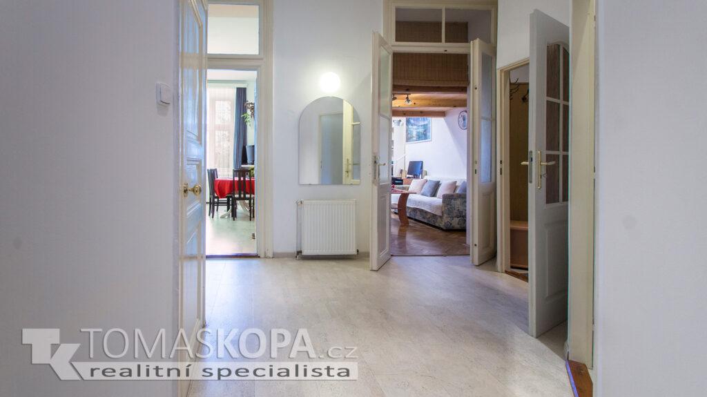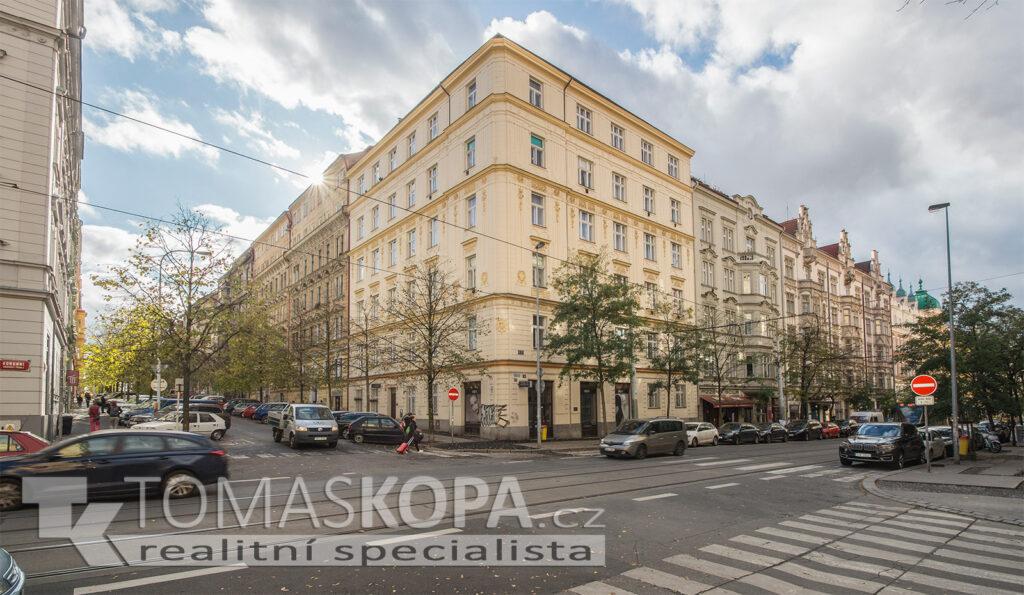 Prodej bytu s dispozicí 3+1 o celkové výměře 96 m², který je ve zvýšeném 1. NP secesního cihlového domu s výtahem v pražské městské části Vinohrady. Byt sestává z prostorné předsíně, haly (16,95 m²) ze které máme vstup do samostatné šatny s vestavěnými skříněmi, koupelny s vanou i sprchovým koutem (3,11 m²), samostatné WC, obývacím pokojem (20,96 m²), kuchyně (14,42 m²) ve které je moderní kuchyňská linka se spotřebiči a dvěma pokoji (16,74 m² a 17,16 m²). V menším z těchto pokojů je vybudováno dřevěné patro na spaní (cca 6 m²). Stropy jsou v tomto bytě vysoké 322 cm. K bytu náleží sklep o výměře 5,24 m². Dům prošel kompletní rekonstrukcí. V místě je veškerá občanská vybavenost, v blízkosti zastávka tramvaje s rychlou dostupností do centra. V blízkosti bytu se nachází nespočet kaváren a restaurací, náměstí Míru s kostelem sv. Ludmily, Divadlo na Vinohradech, městské parky a sady s možnosti procházek a odpočinků. Parkování je možno v ulici.
