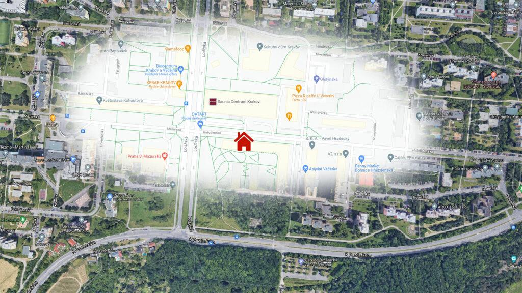 V místě je veškerá občanská vybavenost a skvělá dopravní dostupnost – Na metro „C“ Kobylisy 7 min. busem.