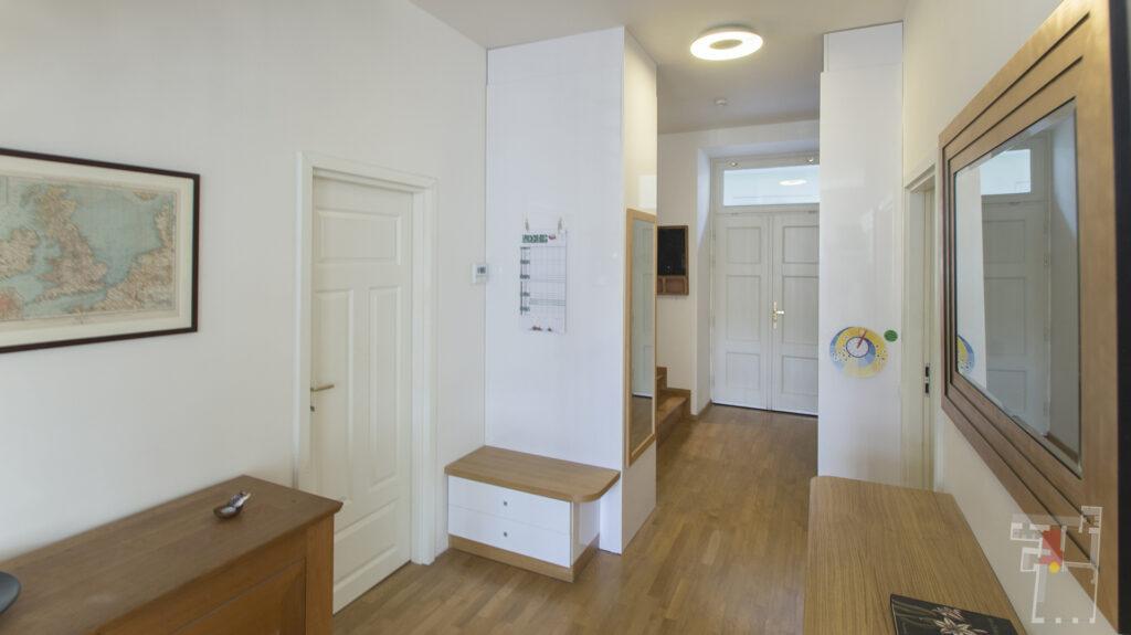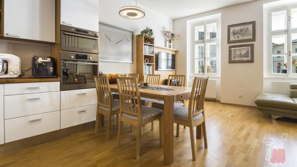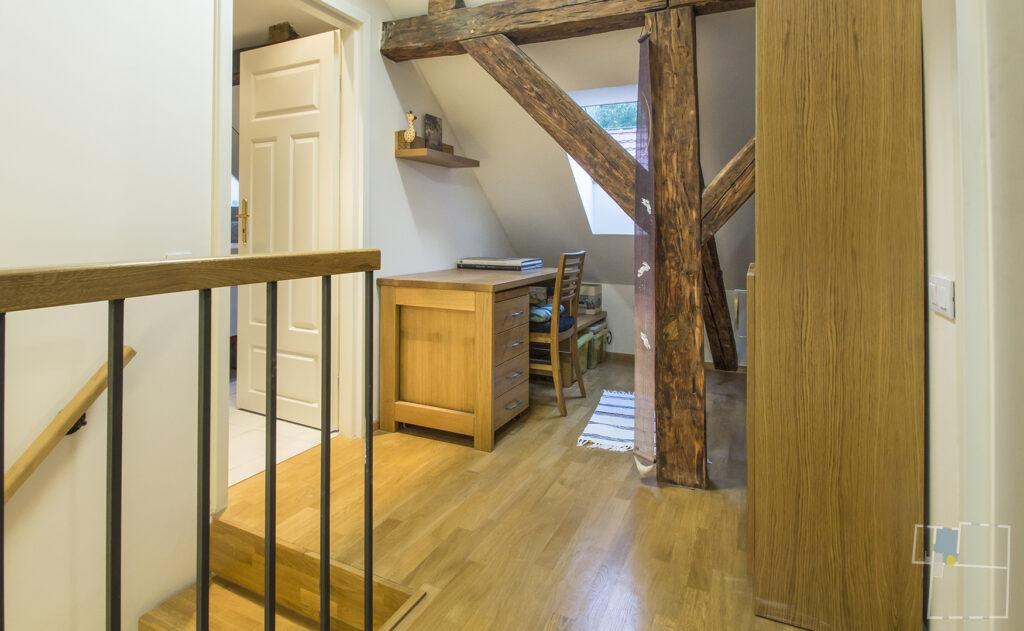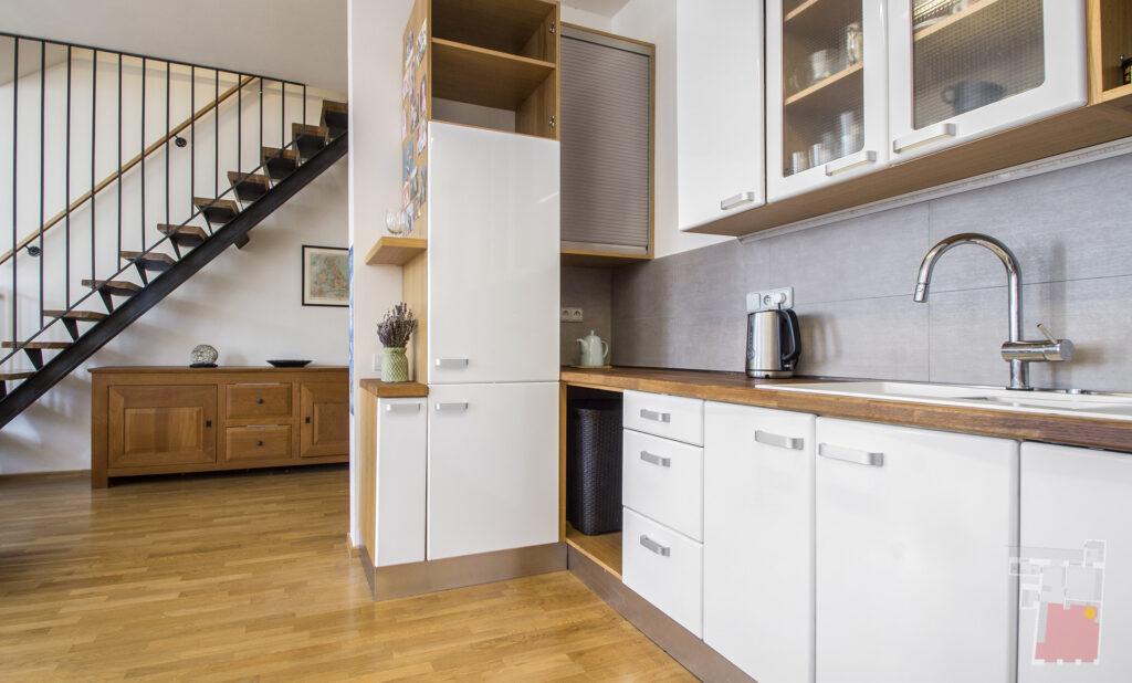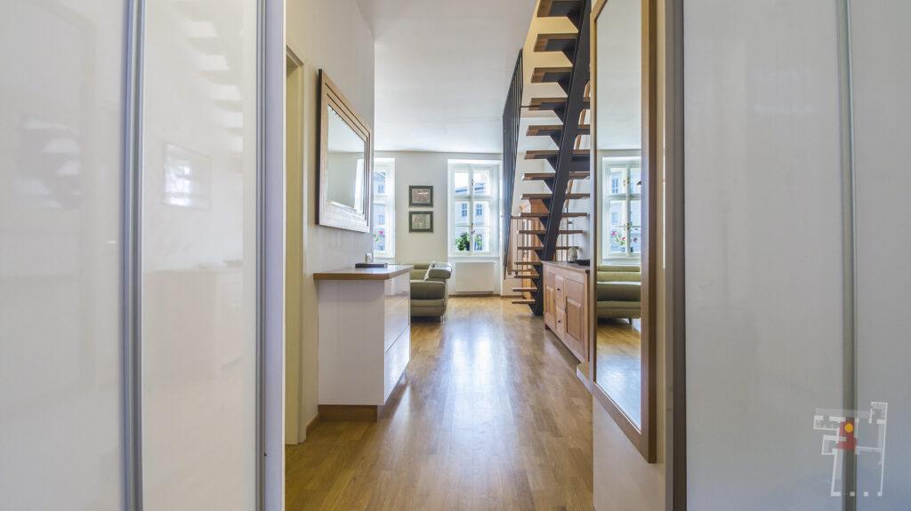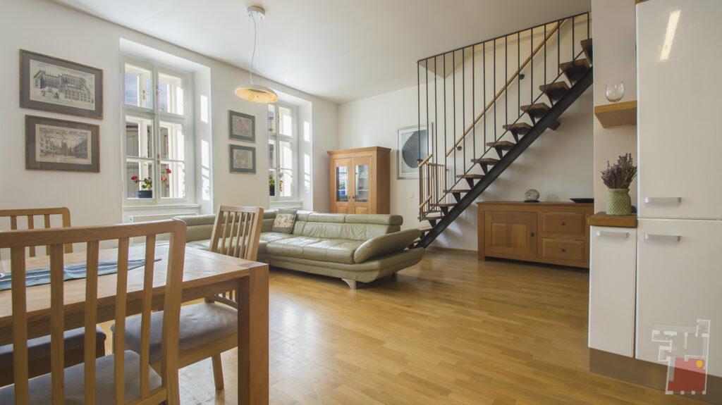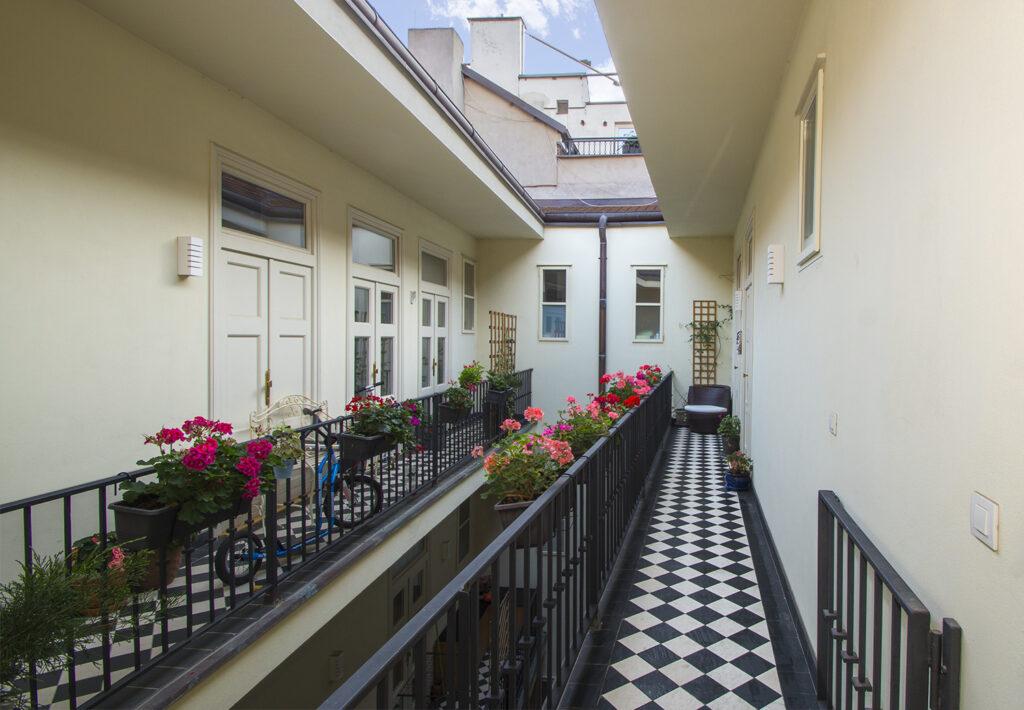 Prodej krásného mezonetového bytu s dispozicí 4+kk o výměře 137,2 m², který se nachází ve 3. a 4. nadzemním podlaží historického domu s citlivě renovovanými původními prvky (kamenné schodiště domu, kamenné a kovové konzoly podpírající pavlače). Dům, stejně jako byt, prošel před šesti lety kompletní rekonstrukcí, součástí domu je prostorný výtah. V bytě jsou zachována špaletová okna, veškeré podlahy jsou z dubových parket, provedení dveří a koupelen je stylově jednotné.