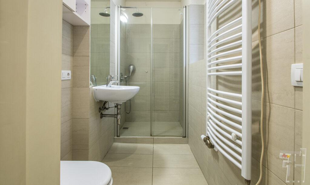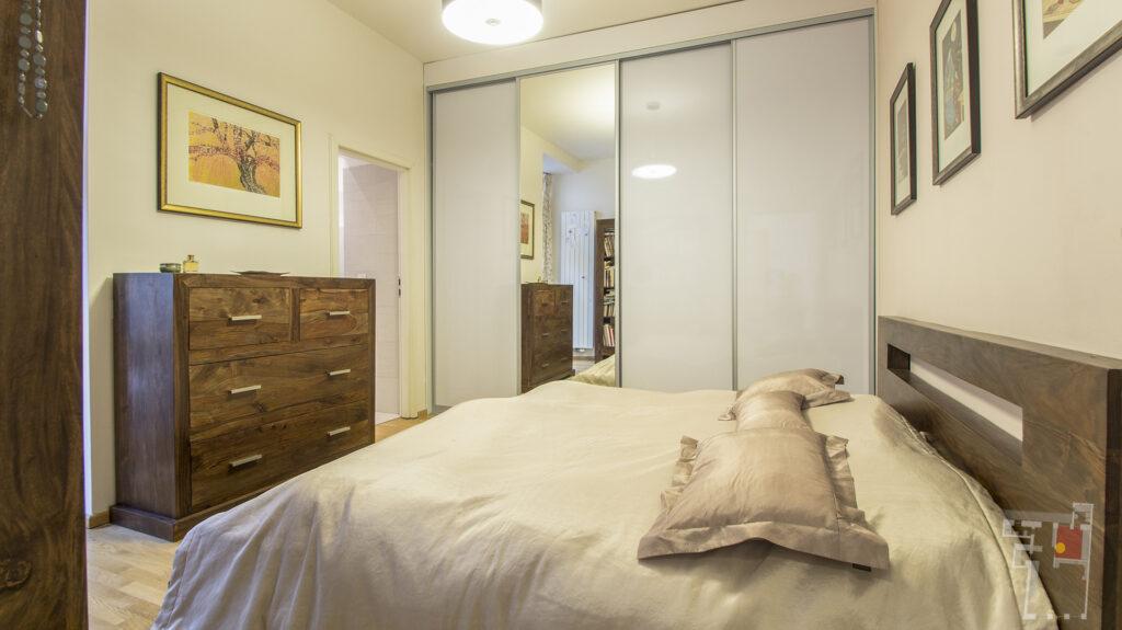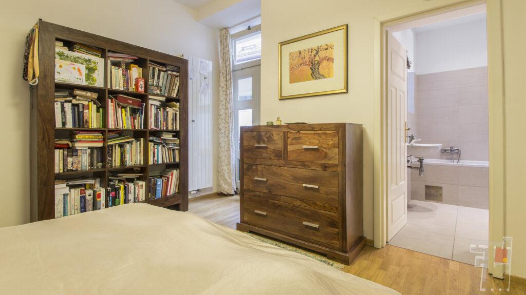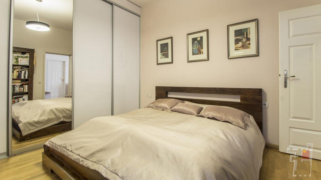 Byt sestává ze vstupní haly (11,3 m²) s úložnými prostory (skříně), velkého obývacího pokoje s kuchyňským koutem a kuchyňskou linkou se spotřebiči (38,4 m²), jehož okna směřují na severozápad, ložnice (14,6 m²) s francouzským vstupním oknem na samostatnou pavlač a s vlastní koupelnou vybavenou vanou (4,5 m²). Další koupelna se sprchovým koutem (4,0 m²) je přístupna z haly. Z této haly je též vstup do komory (2,4 m²).