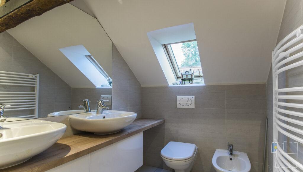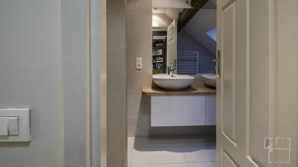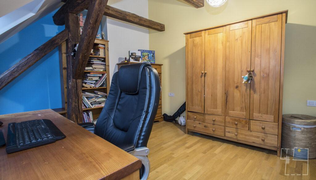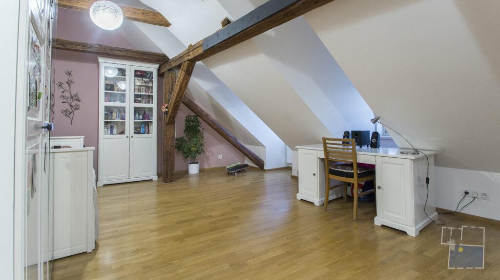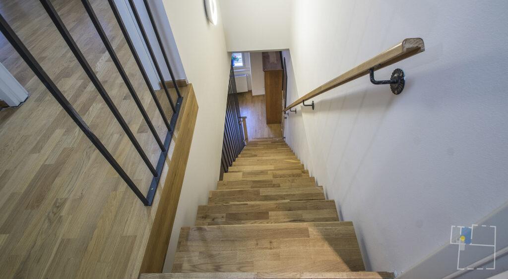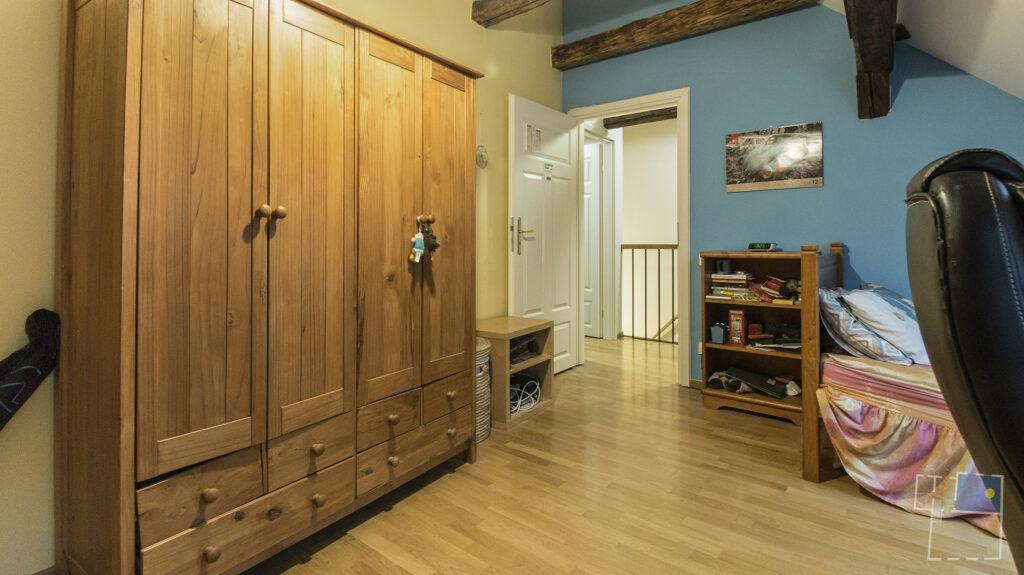 Z obývacího pokoje vede schodiště do patra, které nabízí dva pokoje (19,0 m² a 29,0 m²), chodbu (8,1 m²), kterou lze využít jako pracovnu, a další koupelnu se sprchovým koutem (5,9 m²), kde je umístěn plynový kotel. K bytu patří též pavlač (9,8 m²), která je ve výlučném užívání k bytové jednotce a dále sklep o výměře 3,4 m² – Pavlač ani sklep není započítáván do celkové výměry bytu. Jedná se o byt v osobním vlastnictví.