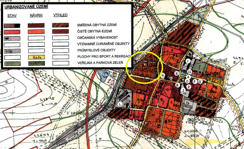 Grafická část ÚP – pozemek je v zastavitelném území obce, pozemek je obsažen ve výhledové části pro využití Čistě obytná území, do pozemku zasahuje z jižní a východní strany návrh komunikace, ze západní a východní strany územní plán navrhuje pruh veřejné parkové zeleně, Pro možnost využití pozemku je potřebná provést změna územního plánu obce