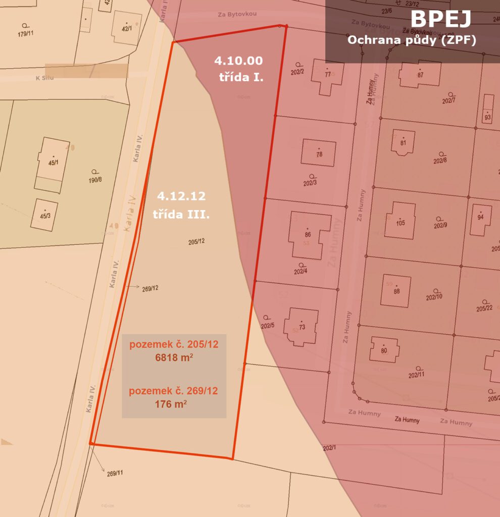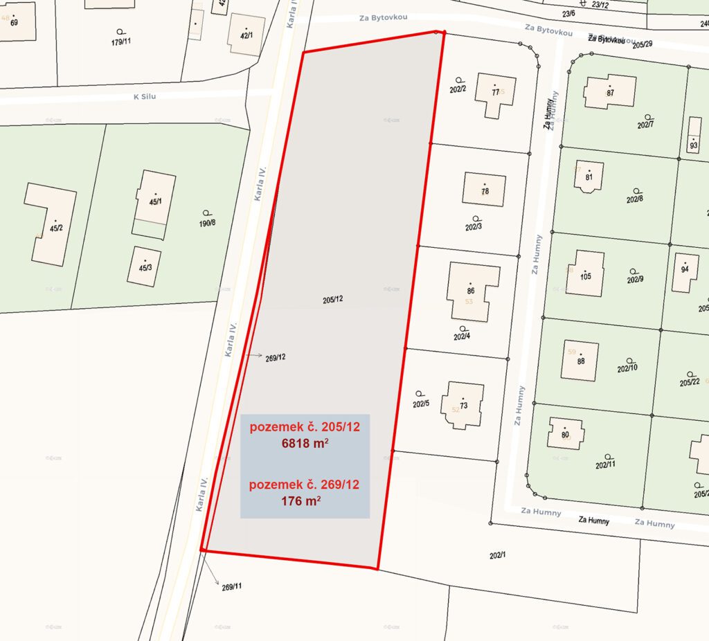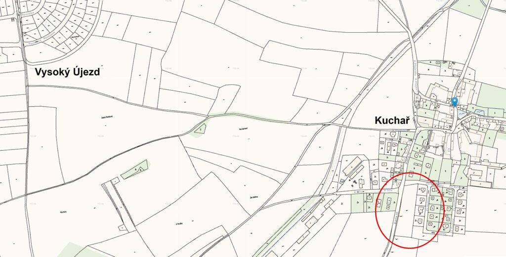 Prodej zastavitelného rovinatého stavebního pozemku parc.č. 205/12 o výměře 6818 m² (cca 40m x 196m) + pozemek parc.č. 269/12 o výměře 176 m², který je v žádané oblasti obce Vysoký Újezd (Kuchař), okr. Beroun s výbornou dostupností do Berouna (18 min) či do Prahy (40min). Z pozemku č. 205/12 je zastavitelných cca 5640 m², zbylých cca 1354 m² je využitelných jako zahrada (je zde i započítáno ochranné pásmo el. vedení (2×7 metrů) – viz. přiložené fotografie. Pozemek lze rozdělit na 3 parcely pro 3 RD (1000+1000+4075 m²), kdy je i počítáno s příjezdovou cestou cca 1000 m².