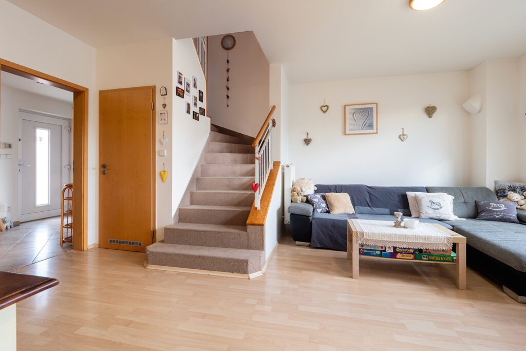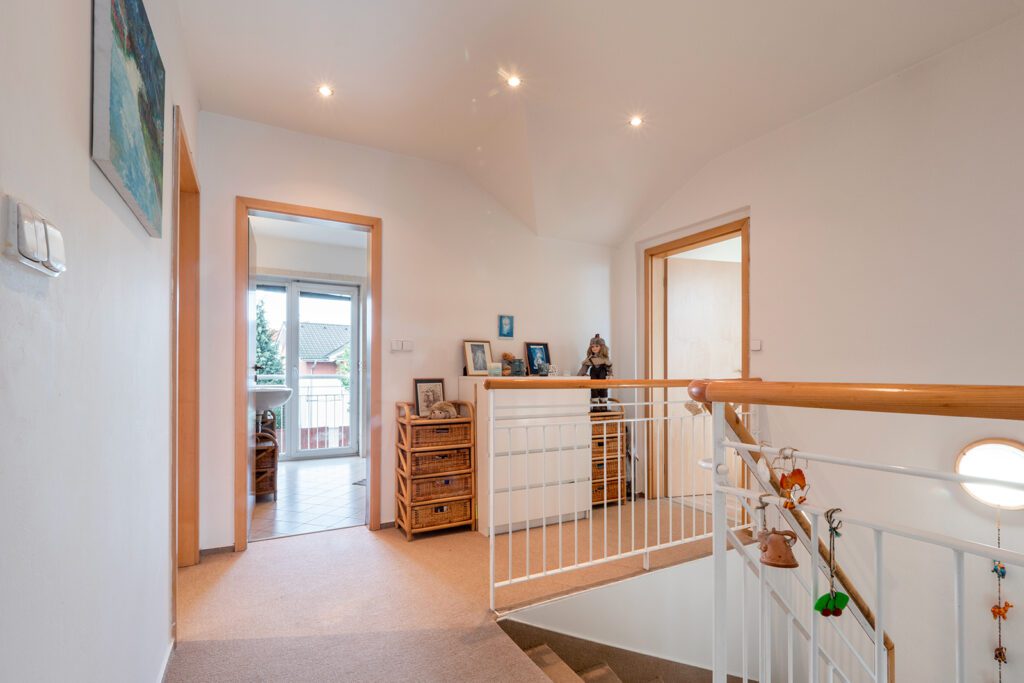 Přízemí domu tvoří prostorná chodba s plynovým kotlem Vaillant, separátní WC a prostorného obývacího pokoje s kuchyňským koutem (42,1 m2) kdy kuchyňskému koutu dominuje na míru dělaná kuchyňská linka, z obývacího pokoje je vstup na zahradu se vzrostlými keři a zpevněnou nezastřešenou terasu. Ze zahrady je možnost vstupu do garáže o velikosti 6x3m. Z obývacího pokoje je vstup do 1.patra, kde je koupelna s rohovou vanou a WC (7,2 m2) a dále ložnice (18 m2) a tři pokoje (9,4 m2, 12,4 m2 a 14,6 m2), zde ze dvou pokojů je vstup na balkon, který je směřován do zahrady (4,8 m2), před schodištěm mezi pokoji je rozlehlá chodba (10,1 m2). Před domem je předzahrádka, kdy vstup do domu je zastřešen. Dům je napojen na veškeré IS.