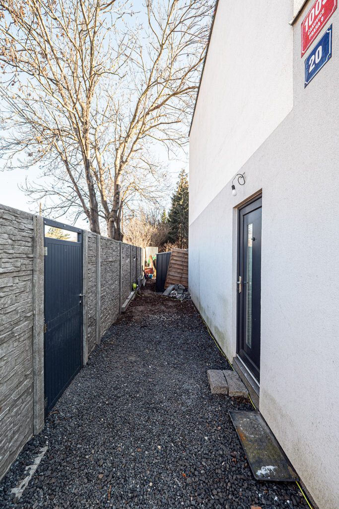 Součástí RD je terasa o výměře cca 14 m2 (z kuchyně), kde je v současné době venkovní sezení. Druhý vchod do domu je z technické místnosti, která je propojena s vchodem do garáže, kterou je možno do budoucna vybudovat (základová deska je již hotova a je součástí základové desky domu + stavební povolení týkající se garáže je stále platné a tudíž je možno s její stavbou kdykoliv začít). Třetí vchodové dveře do domu jsou z hlavní ulice (ul. Kostelecká). Kolaudace RD proběhla v roce 2016. Dům má skvělou dopravní dostupnost do centra Prahy i do okolních měst.