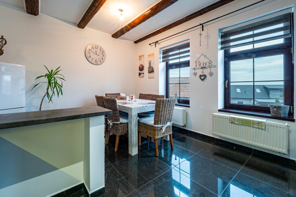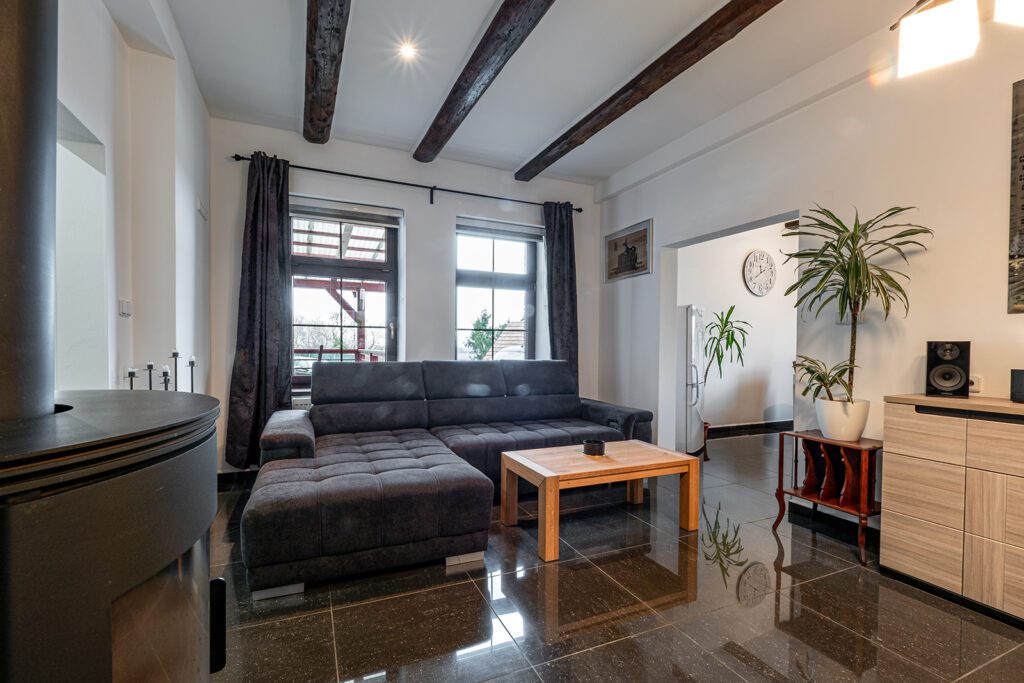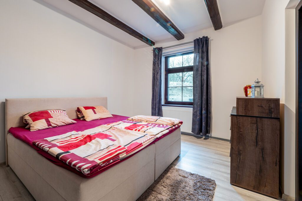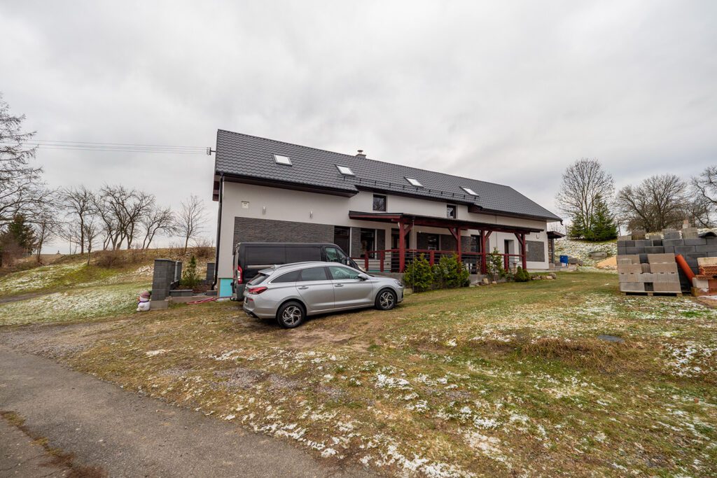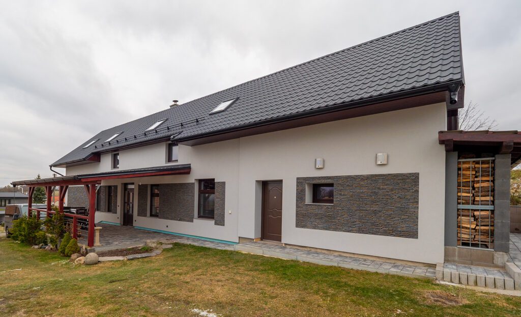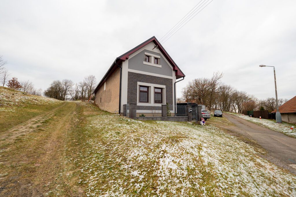 Prodej rodinného domu (v současné době veden jako objekt pro trvalou rekreaci – lze dokolaudovat), který je v půdorysu 20mx5,6m, kde v přízemí je nově zbudován a v nejlepší kvalitě zrekonstruován byt s dispozicí 2+1 a výměrou 77m², kde nalezneme i technickou místnost s elektrokotlem Protherm a bojlerem. Vytápění zajišťuje tento elektrokotel s rozvodem do radiátorů, další zdroj tepla může být krb umístěný v obývacím pokoji. V celém přízemí je položena velkoformátová dlažba a na zdařilost této rekonstrukce se podívejte ve fotogalerii, kde najdete i půdorys. Před vstupem je krytá terasa (30 m²). Dům je (krom západní strany) zateplen s novou fasádou a je nově udělána střecha vč. zateplení. Další samostatný vchod domu je do místnosti (14 m²) ze kterého vede schodiště do 2.NP (podkroví), které je v současnosti předěláváno na obytné místnosti, kde zde může vzniknout samostatný byt s výměrou 111 m², případně lze propojit s přízemím, kdy může vzniknout obytný prostor 188 m². Dům je napojen na elektřinu, vodu a kanalizaci. Na pozemku (600 m²) je již připravena základová deska pro dvougaráž, kterou lze dobudovat. Dům je dislokován na okraji obce, kdy v okolí domu již není plánována žádná výstavba RD.