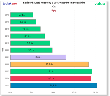 Dostupnost bydlení v Česku se za poslední dekádu zásadně proměnila. Zatímco úrokové sazby po roce 2023 postupně klesají, ceny bytů znovu rostou a celková zátěž hypoték je dnes mnohem vyšší než v roce 2015. Podle analýzy Valuo.cz se měsíční splátka 80% hypotéky na 30 let zvýšila z 5 280 Kč na 20 310 Kč – tedy téměř čtyřnásobně.