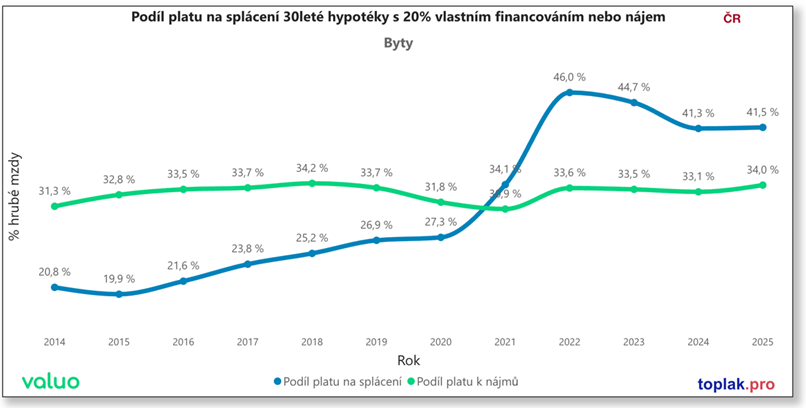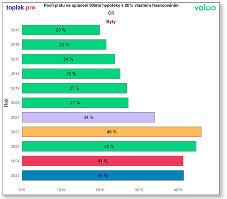 Od té doby se situace stabilizovala: úrokové sazby klesají, mzdy rostou a splátky se daří udržet nižší i přes mírný růst cen bytů. Aktuálně (2025) tvoří splátka průměrného bytu 41,5 % hrubého platu.