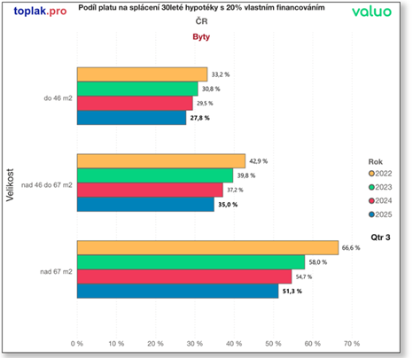 To znamená, že i když ceny bytů zůstávají vysoké, jejich splácení je díky mzdovému růstu o něco snazší než před třemi lety.