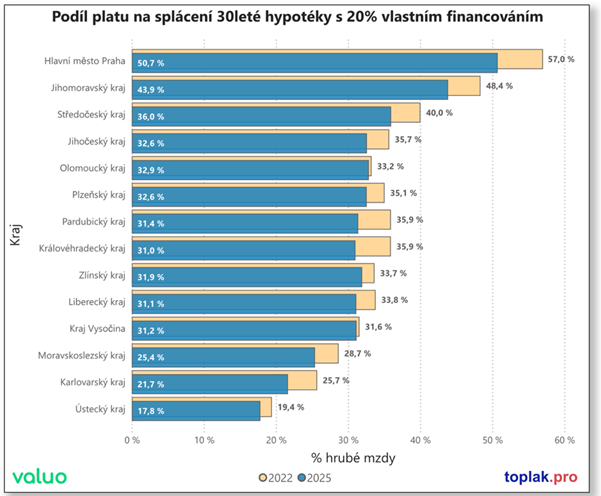 Nejdražší bydlení je stále v Praze, kde splátka hypotéky představuje 51 % průměrného platu. To je pokles oproti 57 % v roce 2022, ale Praha zůstává nejméně dostupným regionem. Na dalších příčkách jsou Jihomoravský a Středočeský kraj, kde podíl splátky přesahuje 40 %.