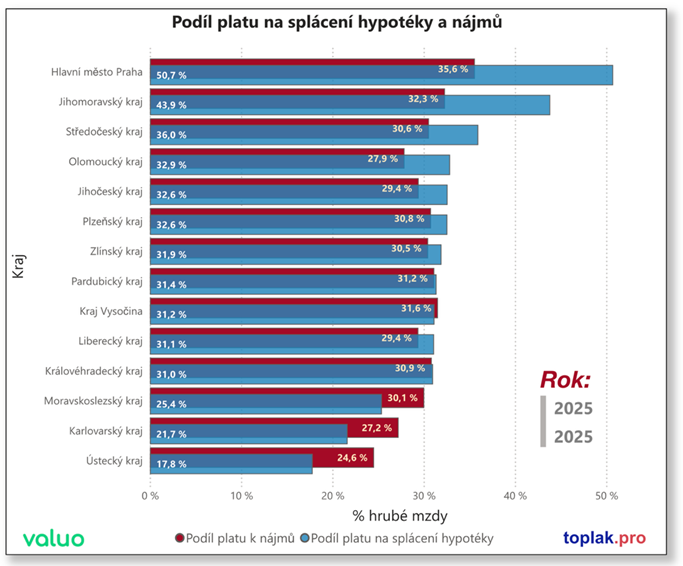 Rozdíly mezi regiony jsou patrné na první pohled. V Praze tvoří splátka hypotéky nebo nájem více než polovinu příjmu domácností s nižšími mzdami, zatímco v Ústeckém, Karlovarském či Moravskoslezském kraji se tyto náklady pohybují výrazně níž.