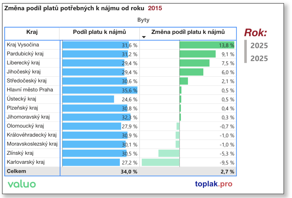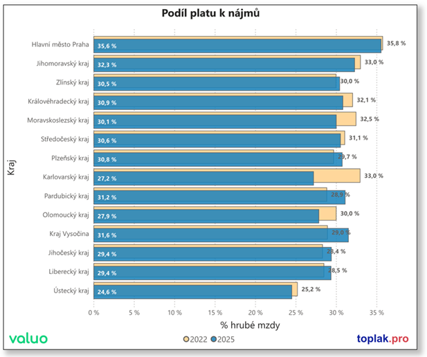 Podíl platu potřebný na nájem od roku 2022 většinou klesá. Největší zlepšení vidíme v Karlovarském kraji, kde se snížil z 33 % na 27,2 %. Nejlevnější byty k nájmu ve srovnání s průměrným platem jsou v Ústeckém kraji, kde podíl činí 24,6 %.