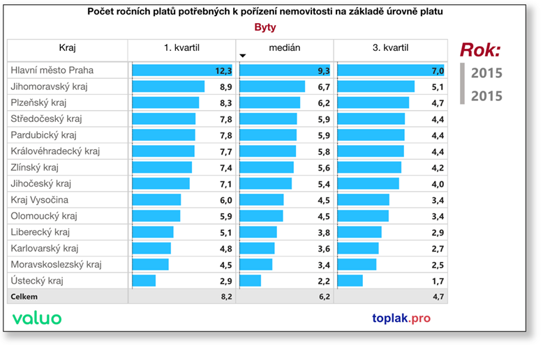 - lidé s vyššími příjmy (3. kvartil) si mohou dovolit byt v Praze už za 9 ročních platů, a v Ústeckém kraji za 3,5 platu.