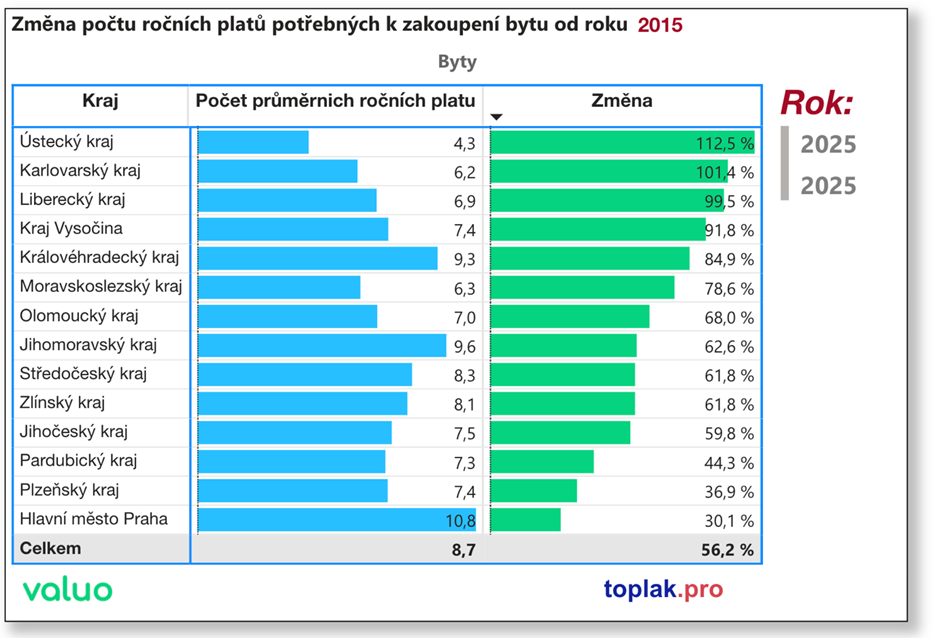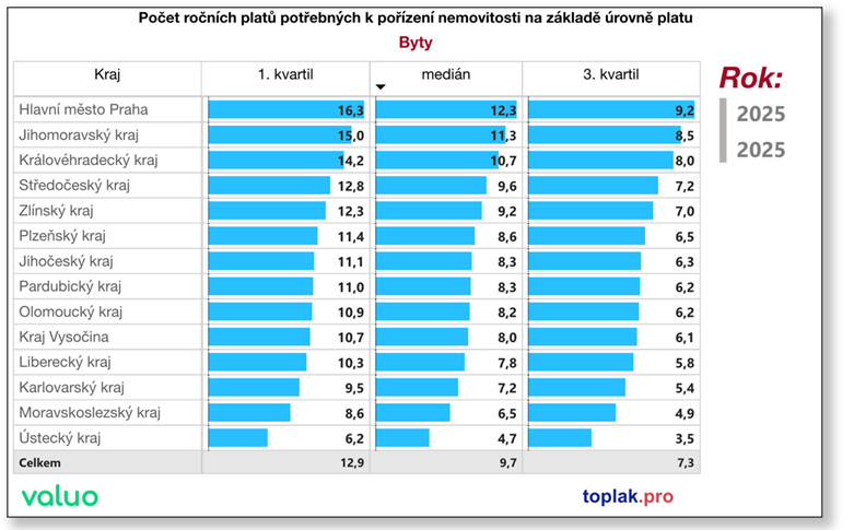 V roce 2025 je potřeba v průměru 9,7 ročního platu (medián) na pořízení bytu v Česku. V Praze je to 12,3 platu, v Ústeckém kraji 4,7 platu.