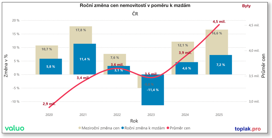 Růst cen bytů je od roku 2023 znovu výrazný, v roce 2025 meziročně +17 %. V poměru k platům to však znamená jen reálný nárůst o 7 %, protože mzdy rostou rychleji než v předchozích letech. Rok 2024 přinesl růst cen o 12 %, ale efektivně jen 4,6 % v poměru k mzdám.